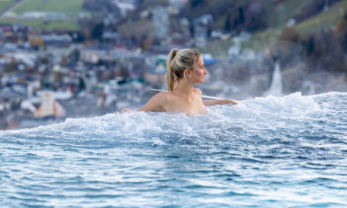 Vor einer großen Fensterfront mit spektakulärem, freiem Blick auf Schladming und zur Planai erwarten Sie in unserem Family-Spa ein Schwimmbad und ein großer Whirlpool.