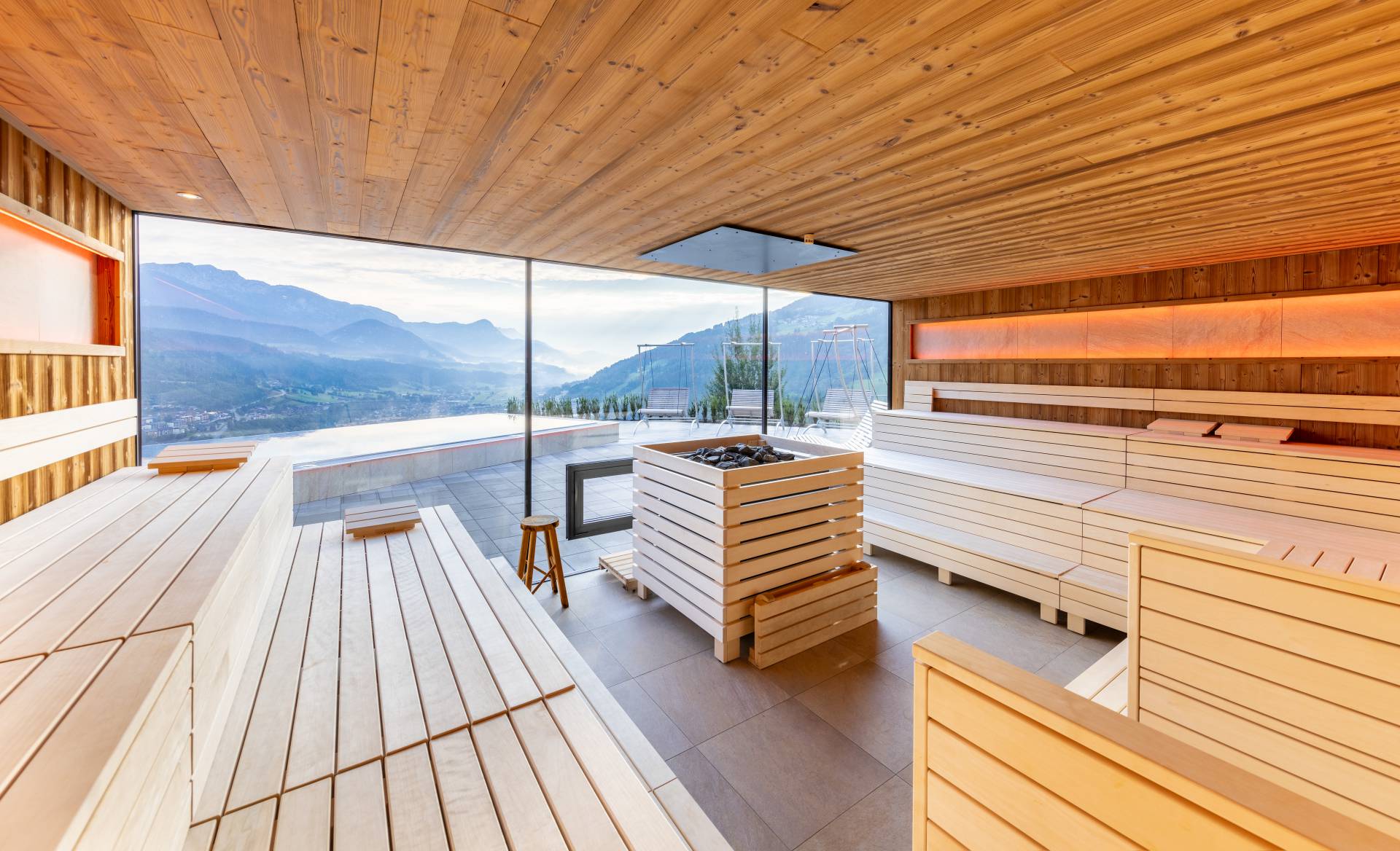 Neben den bisherigen Saunen erwarten Sie dann 3 unsere Saunen-Highlights, eine Panorama-Lounge sowie neugestaltete Ruheoasen mit grandioser Aussicht auf Schladming und den Dachstein. Seit 2024 gibt es neue Highlights im Saunabereich, ein Kaltwasserbecken zum Abkühlen und ein Warmwasserbecken.