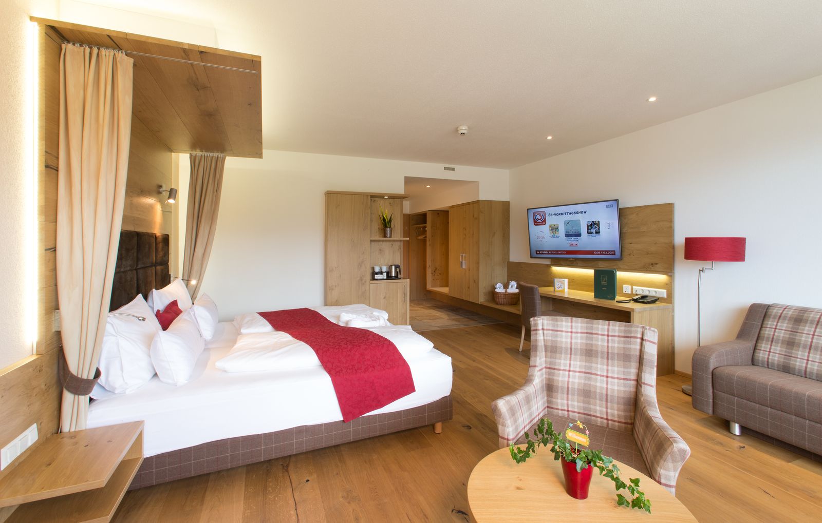 The junior suites either have a valley view (Dachstein view) or a view of the Niedere Tauern towards Hochwurzen (sunny side).