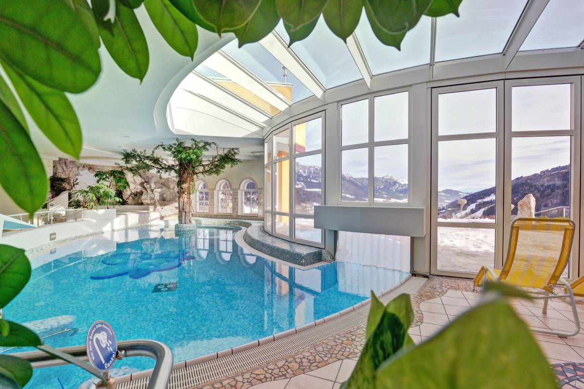 In front of a large window front with a spectacular, unobstructed view of Schladming and the Planai, you will find an indoor swimming pool and a whirlpool in our Family Spa.