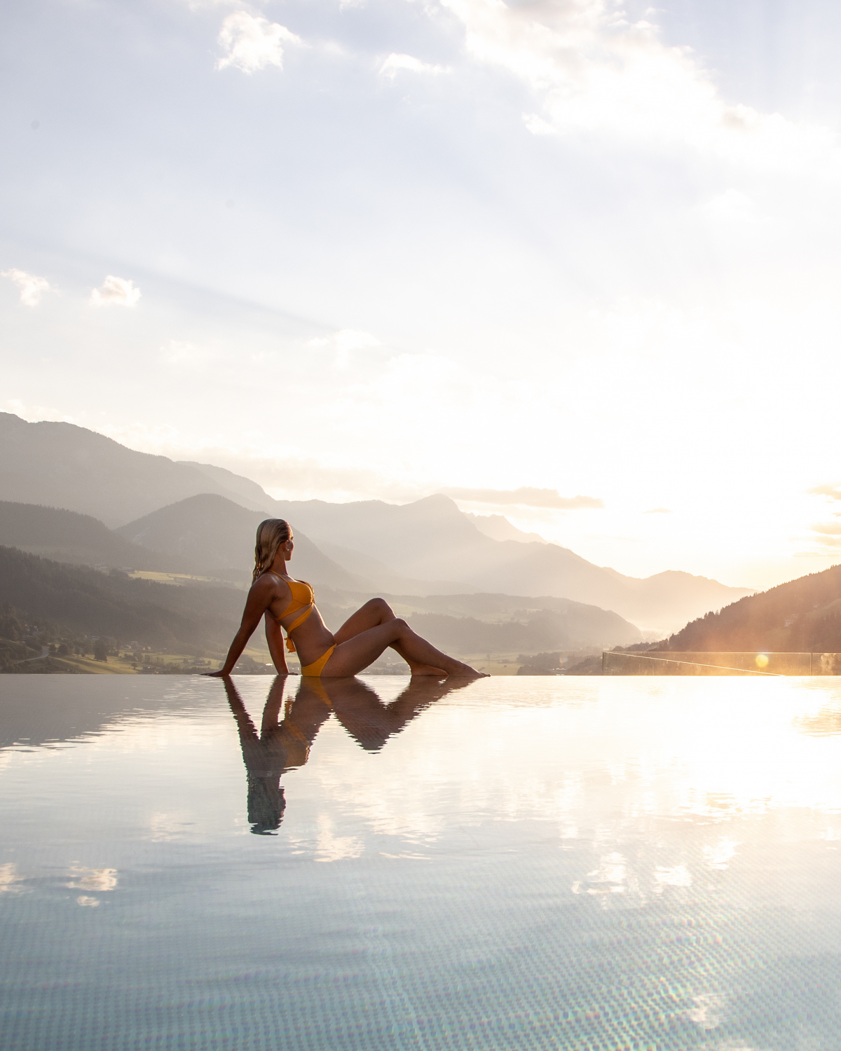 In the adults' spa, anyone over the age of 16 can enjoy the outdoor infinity pool, the bubble loungers and massage bench, as well the pool relaxation rooms. The 25 x 6 m infinity pool is located in the garden and faces the valley. At 32 ° C you can enjoy swimming in the mountain air with a dream view. A special experience - in summer and winter.